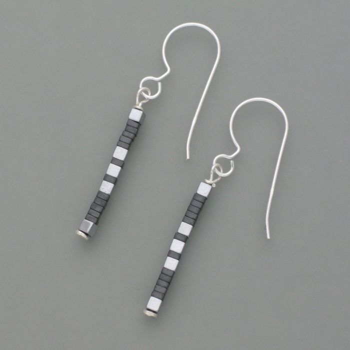 These sporty earrings consist of square hematite discs between which polished silver cubes appear in a regular rhythm. This creates an exciting light / dark contrast, but the earrings still appear harmonious and balanced. You can wear them «solo», but you can also complement them with a matching necklace or bracelet.