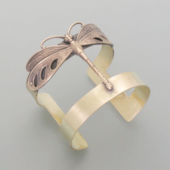 This bangle made of brass is a real masterpiece of design. The bangle is creafted with two parallel bars that are, in turn, connected by two struts. An artfully crafted dragonfly is riveted onto the struts. It is lightly blackend and decorated with ornaments that give the bangle its romantic and playful character. Its surface is hand-forged, which emphasizes the authentic artistic appearance of this piece of jewellery. It is available in one size only; however, the size can be carefully adjusted for a slight change in fit.
