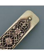 The base of this beautiful hair clip is made of bronze. A filigree ornament in the Art Nouveau style made of tombac is placed on it. In addition, the bronze around the ornament was slightly blackened; this creates an interesting space that impressively emphasizes the artistic style of this hair clip. The hair clip is equipped with a mechanism that is suitable for all hair thicknesses.