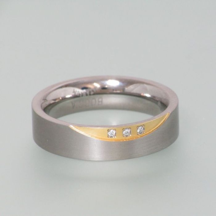 This simple ring is made of titanium and impresses with its clear and simple style. He has a straight profile and at the top of the ring is a small, arcuate heel. There, the ring is gilded and there are three 0.015 ct brilliants used, which enhance the appearance of the ring and give it additional chic. Due to the titanium material they are hard and resistant but still very light and absolutely anti-allergic. They can be complemented by a matching bangle, stud earrings and a chain pendant.