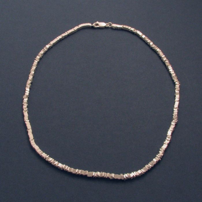 This necklace, which is threaded together with innumerable silver plates in the form of squares, impresses with its simple appearance and versatility. The individual movable plates fascinate with their diffuse and bright matte silver finish. This necklace is a piece of jewellery for any occasion, and is sure to perfectly match every wearer's style. A matching bracelet is also available at our jewellery factory's online store. Information on materials - silver.