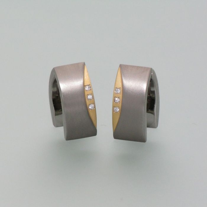 These simple and navette-shaped hoops are made of titanium and have a straight, rectangular profile. The surface is held in the dull gray of the titanium and the earrings are thus modern and timelessly simple. On the front is a bow-shaped heel. At this point, the earrings are gilded and there are each used 3 diamonds. The hoops are equipped with a handy folding mechanism and are completely anti-allergic.